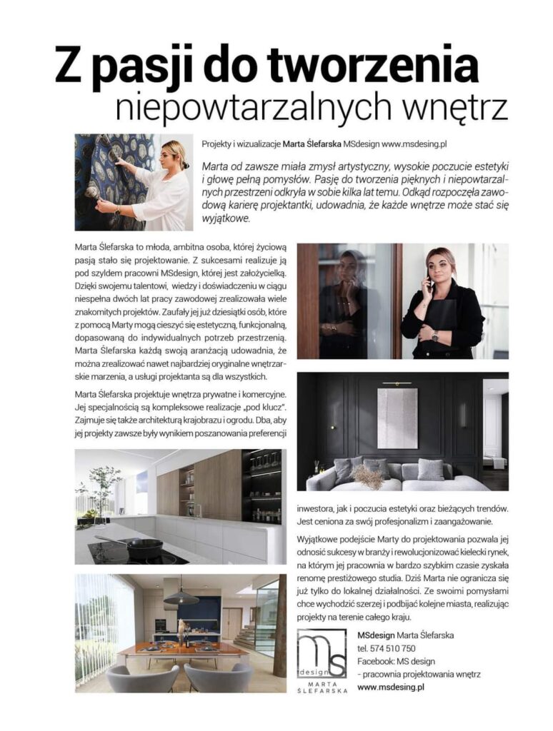 Moją misją jest pokazanie, że dobry projekt jest dla każdego – niezależnie od metrażu czy budżetu. Wyróżnia mnie indywidualne podejście, pełne zaangażowanie i dbałość o detale – od pierwszej rozmowy, przez koncepcję, wizualizacje, dobór materiałów, aż po nadzór autorski i przekazanie gotowej przestrzeni.